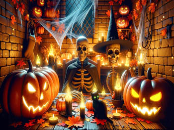 fire blazes, pumpkins gleam, bats fly, the crow caws, a witch flies,